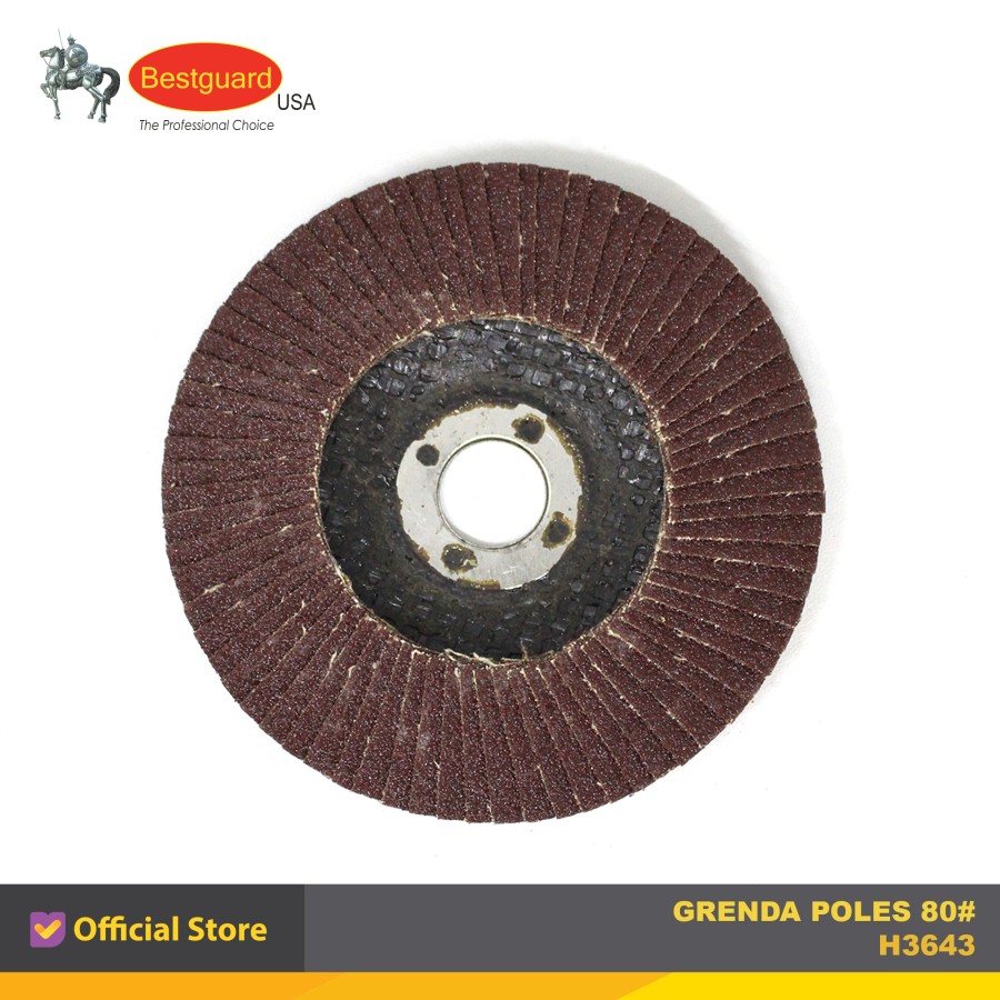 BESTGUARD GRENDA POLES FLAP DISC #80 digunakan untuk pengamplasan hasil pengelasan di bidang stainless steel, besi maupun kayu. Menghaluskan kayu besi dll secara manual adalah pekerjaan yang membosankan dan melelahkan, dengan Flap disc anda tidak perlu bersusah payah. Hanya perlu di pasang di mesin gerinda tangan anda sudah siap mengunakannya.